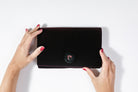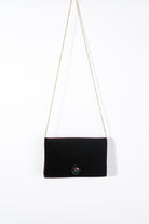 Cartera de terciopelo de algodón color berenjena. Decorada con botón antiguo de terciopelo.