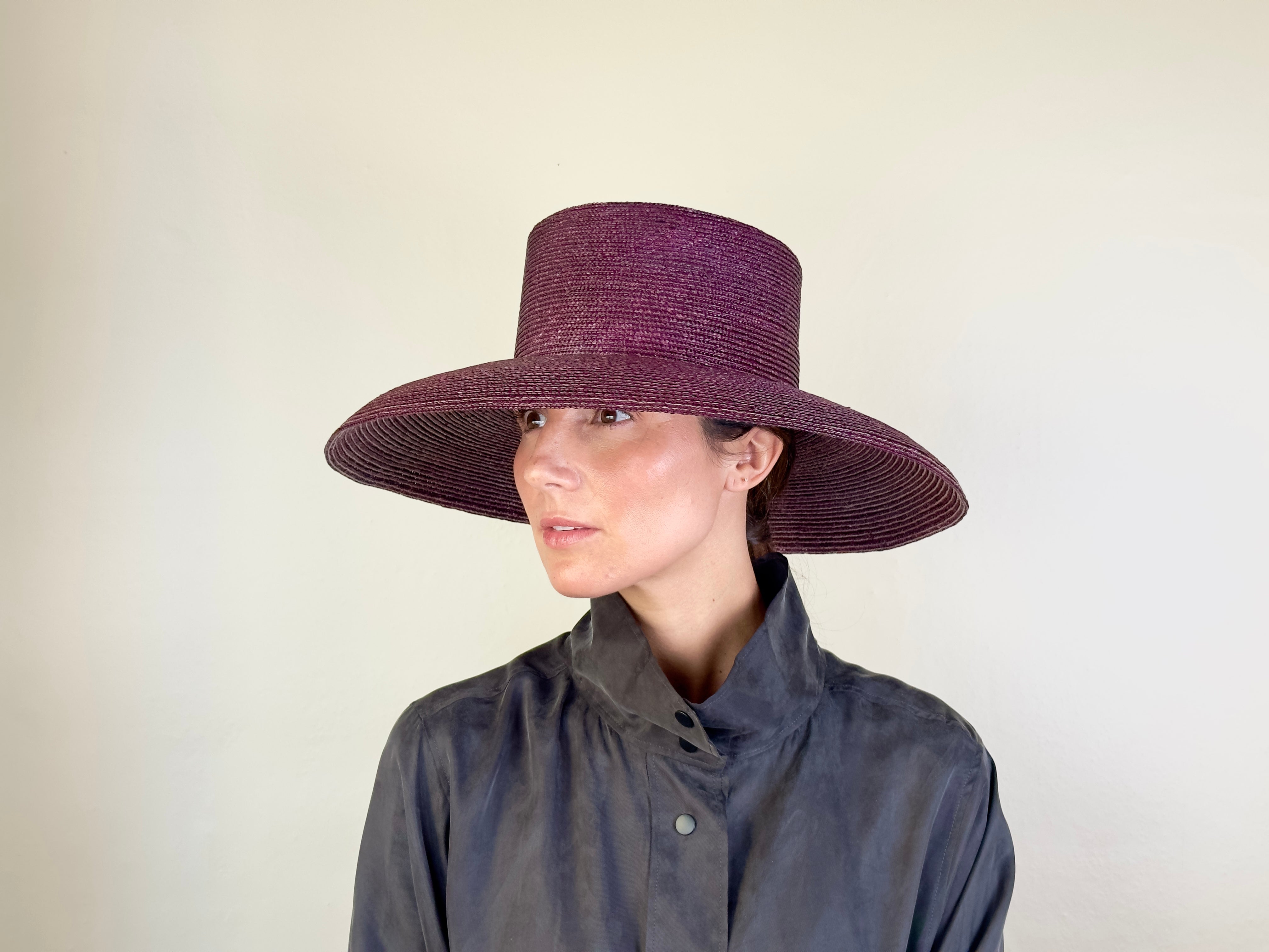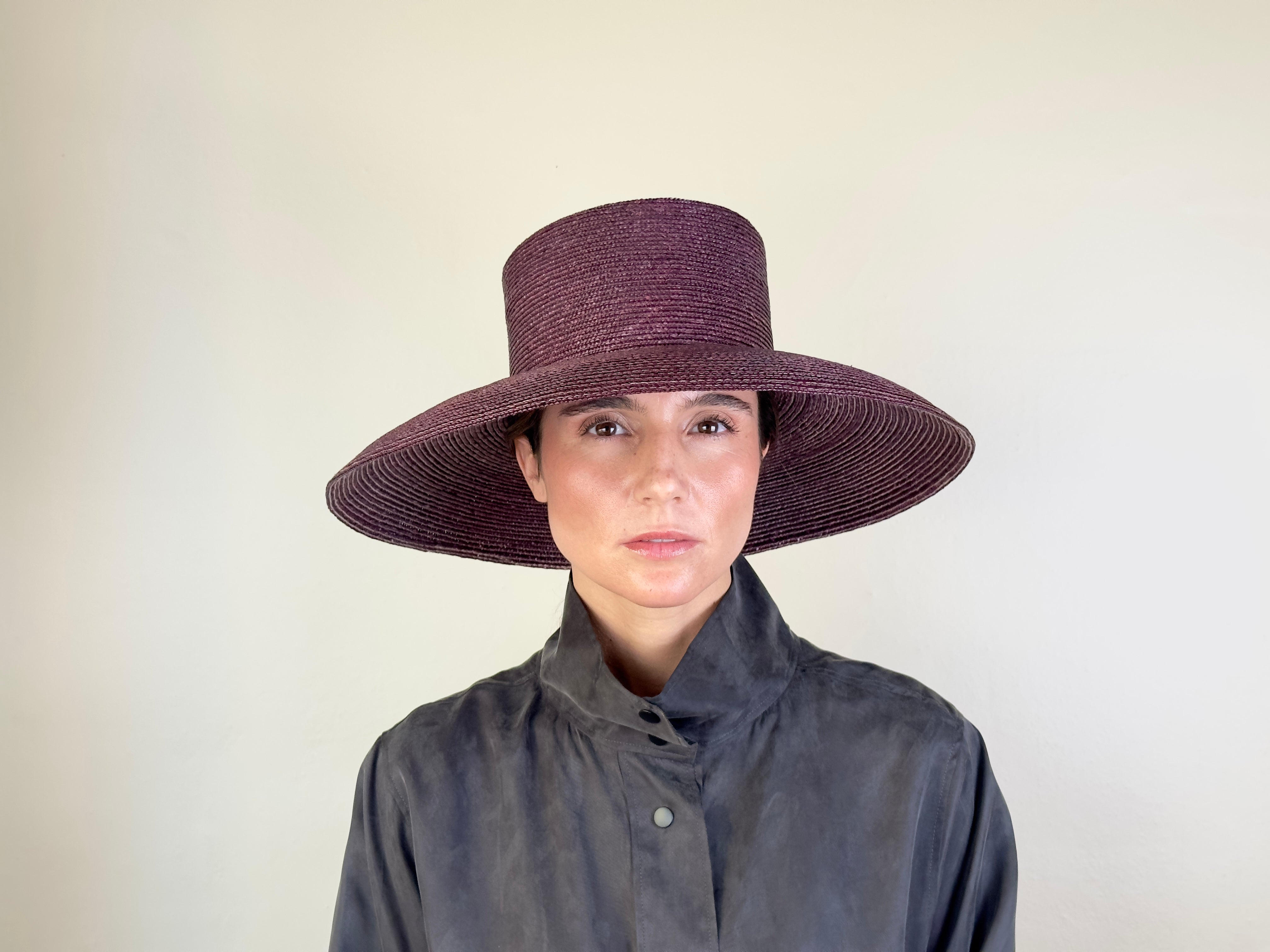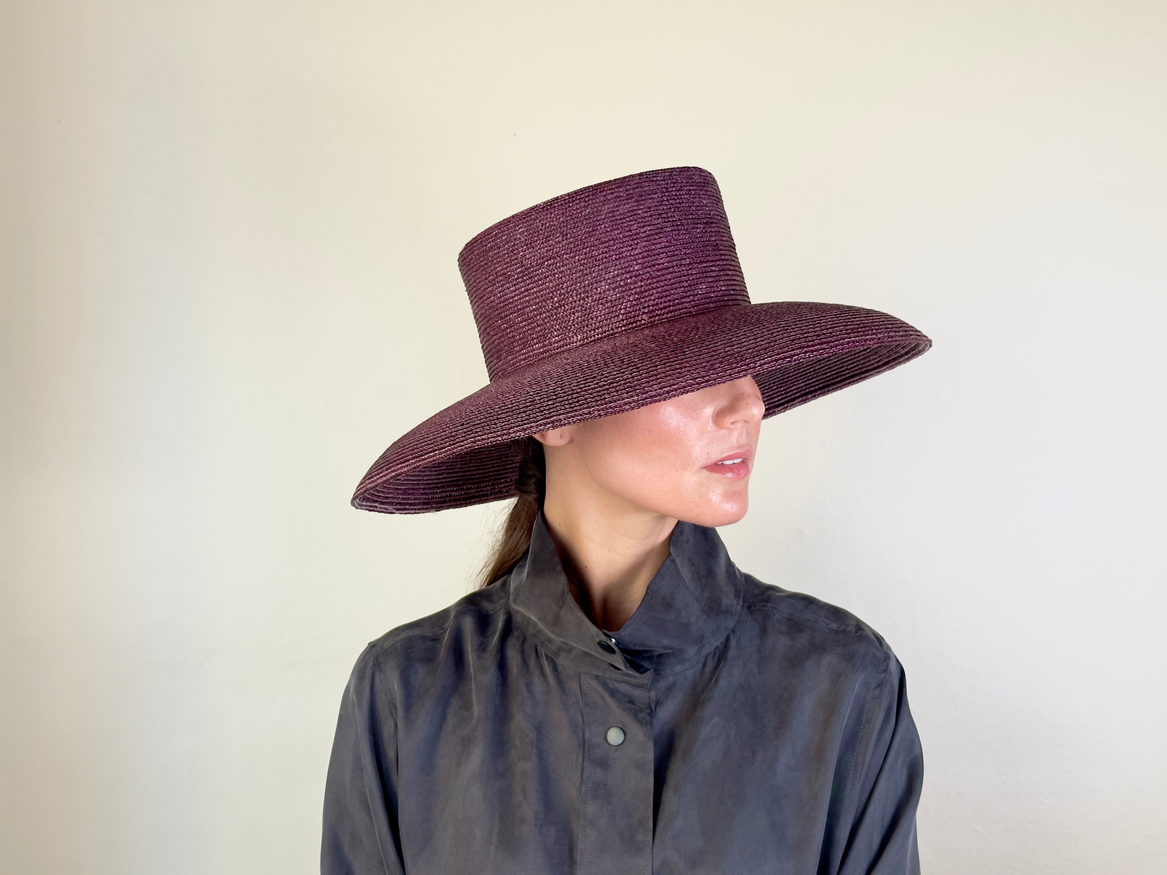 Pamela de paja fina de trigo cosida color burdeos oscuro. Copa cuadrada y ala curva redondeada.