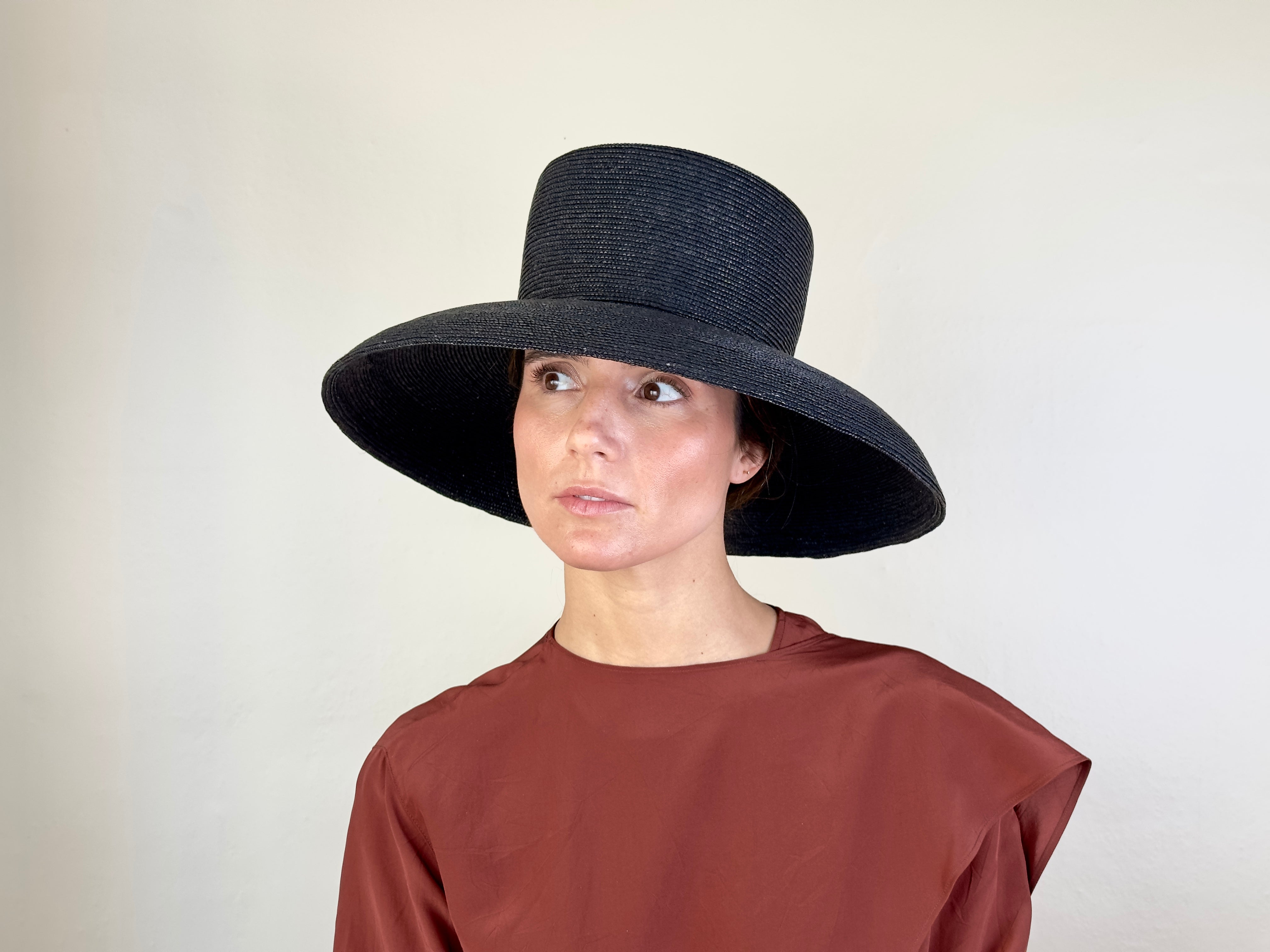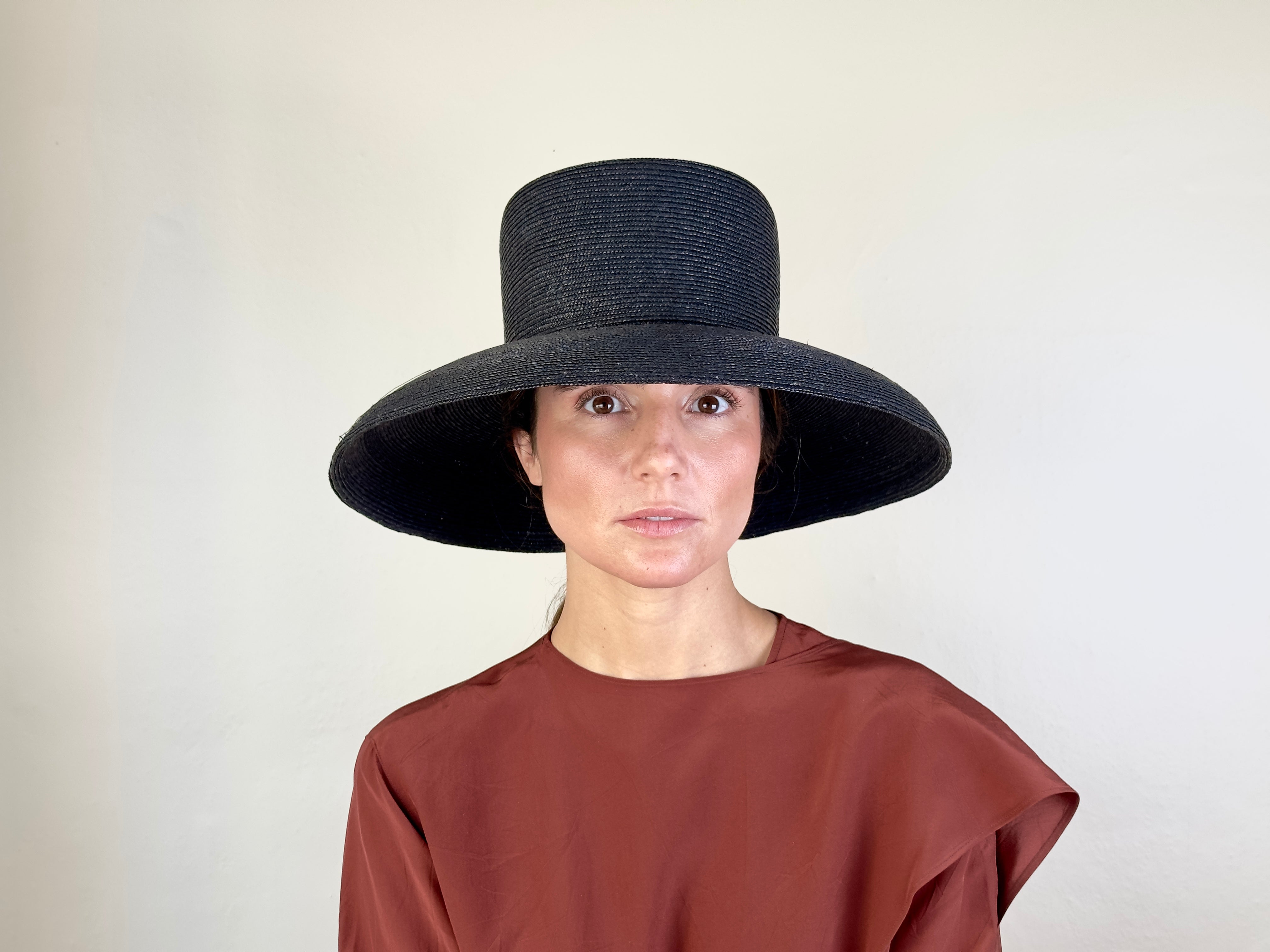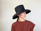 Pamela de paja cosida color negra. Copa cuadrada y ala convexa, más corta en la parte delantera.