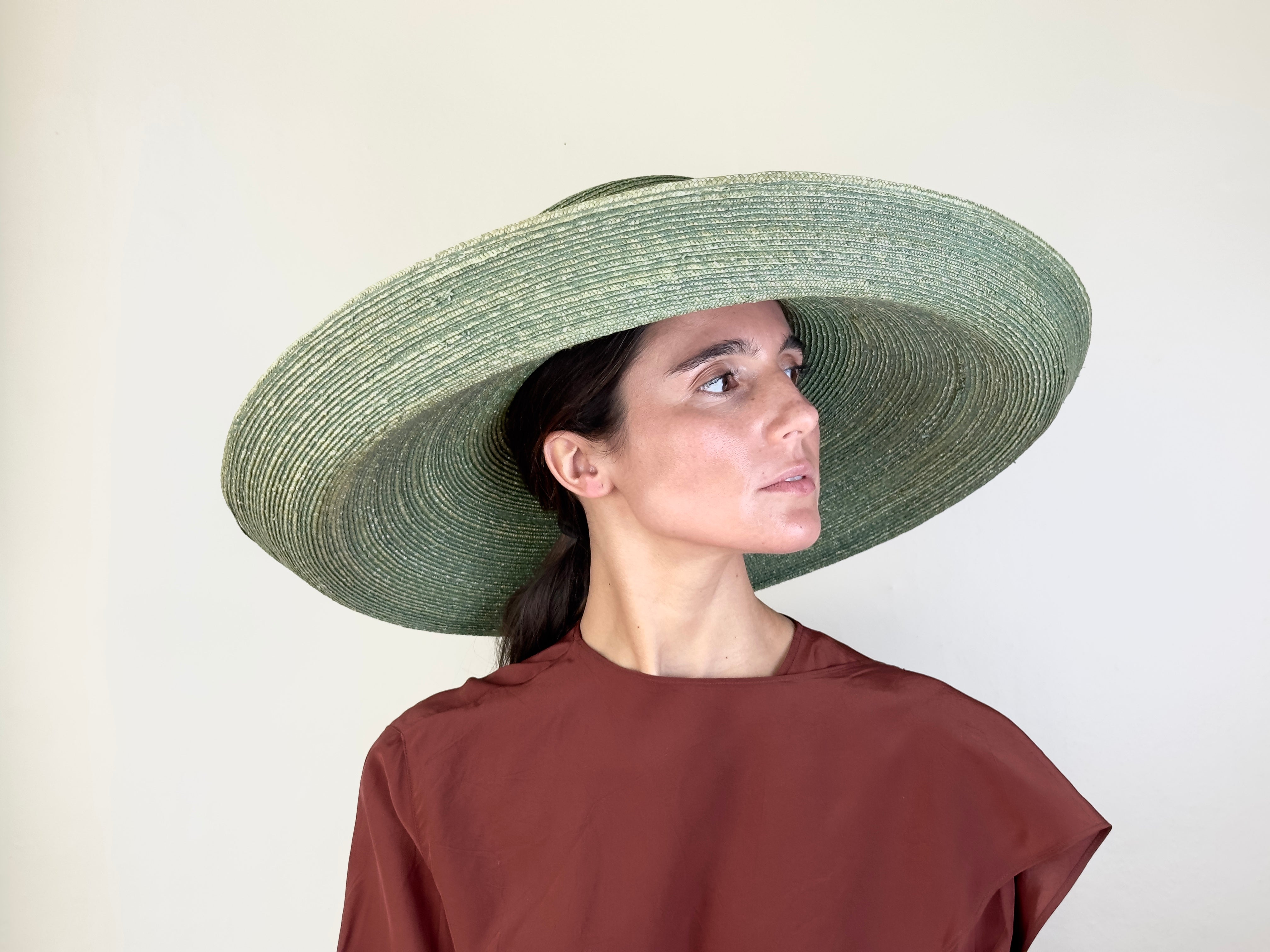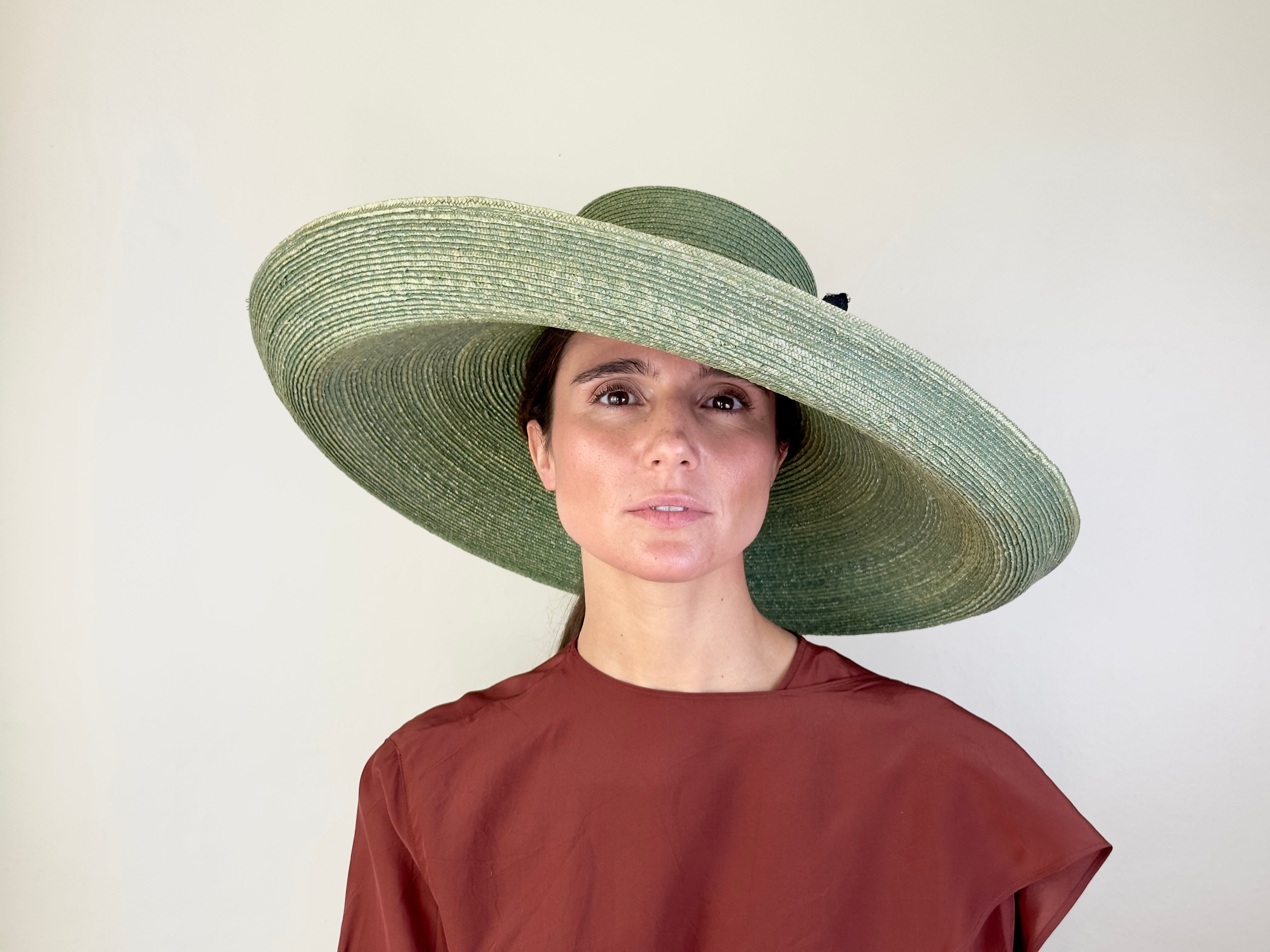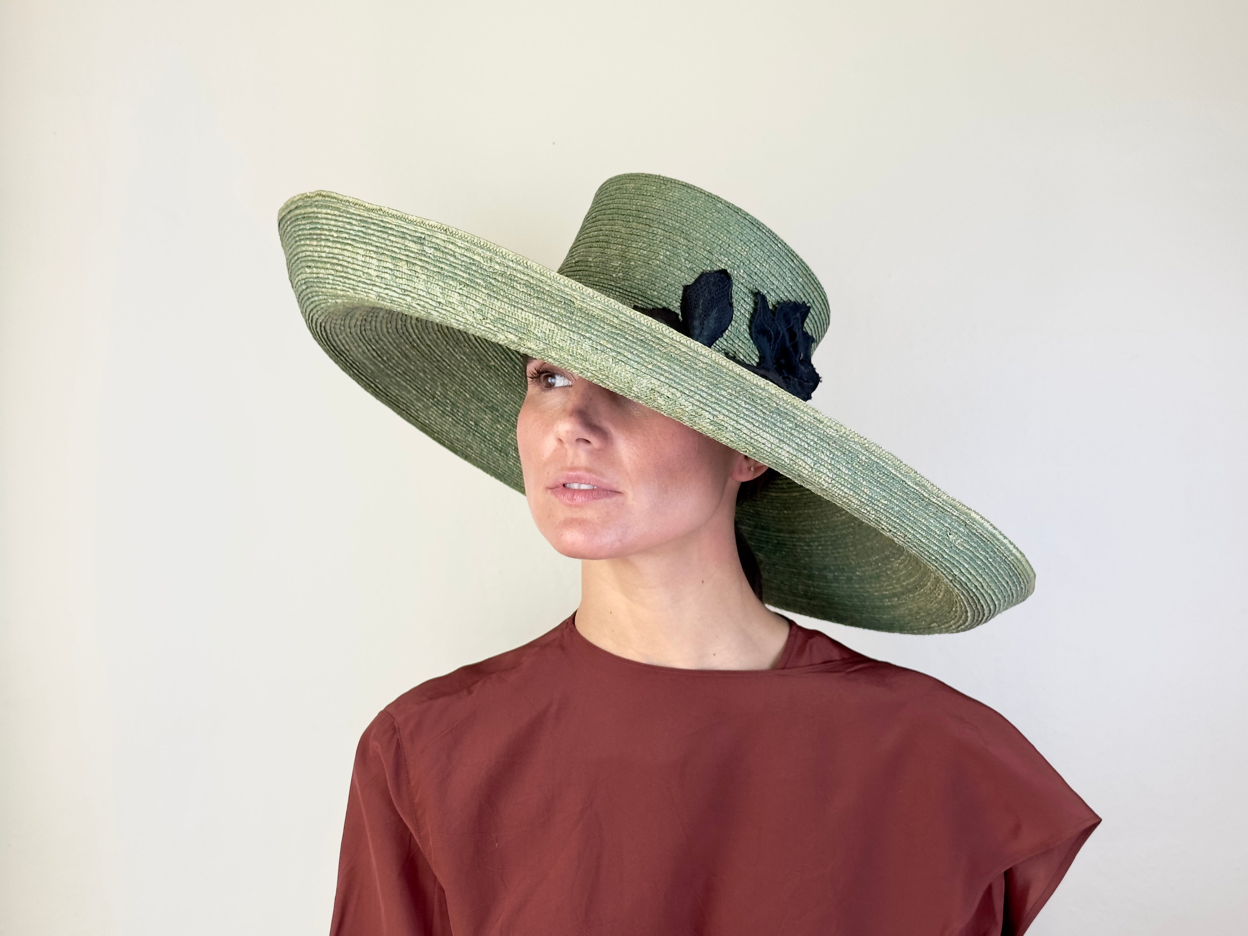 Pamela de paja fina de trigo trenzada y cosida en color verde manzana decorada con aplicación de flores de guipur en color negro rematadas con piedra de cristal negro facetada.