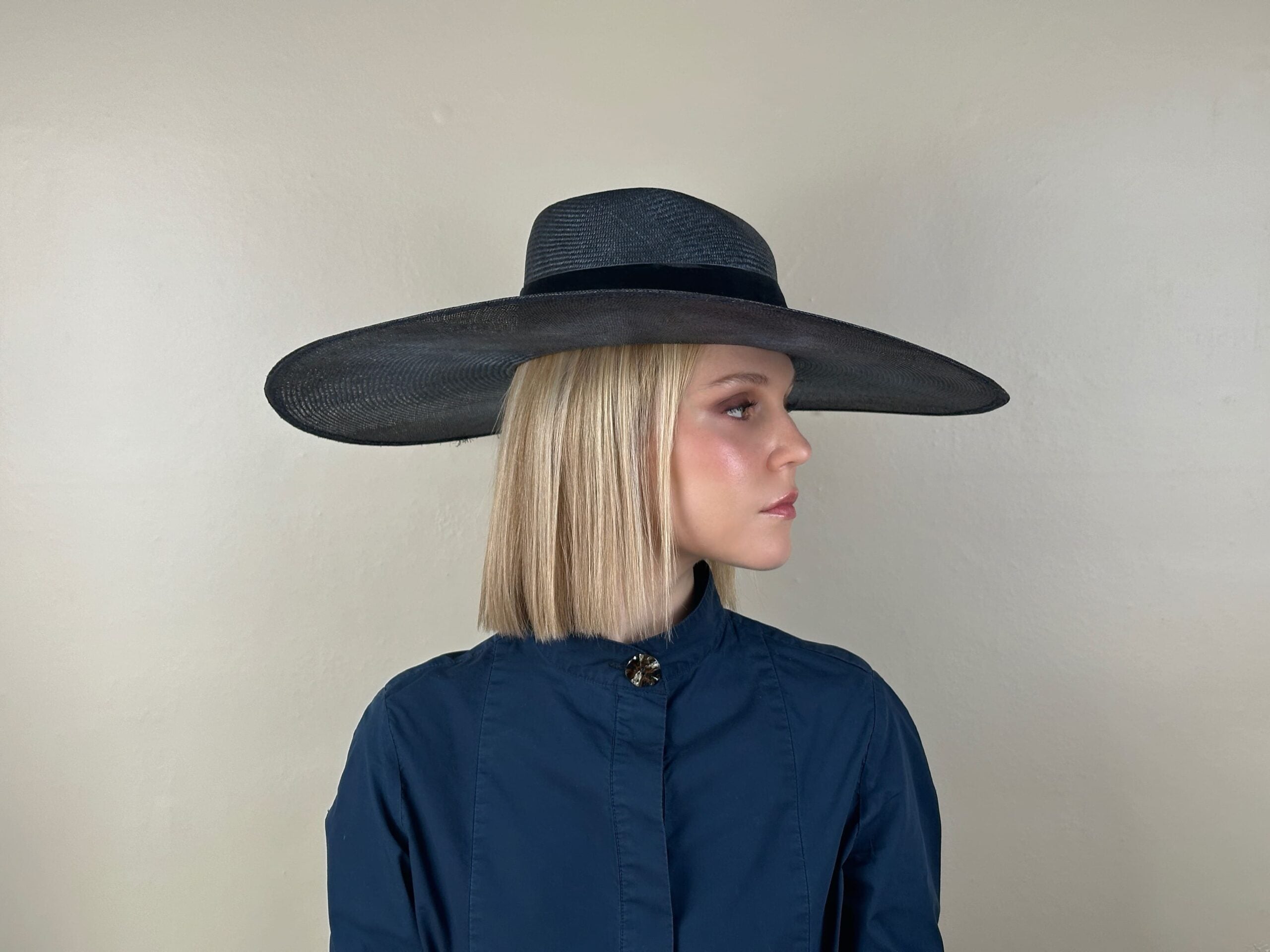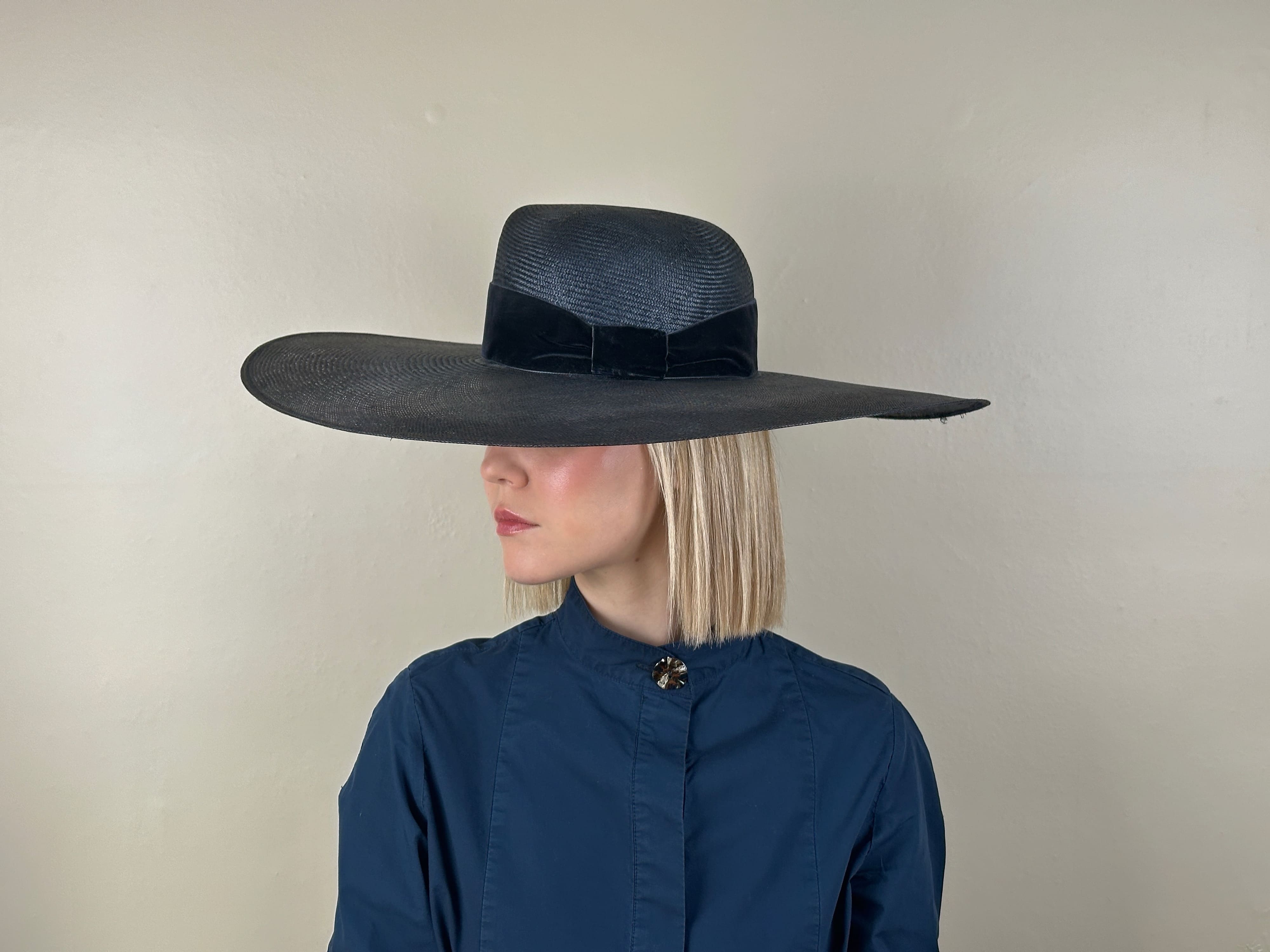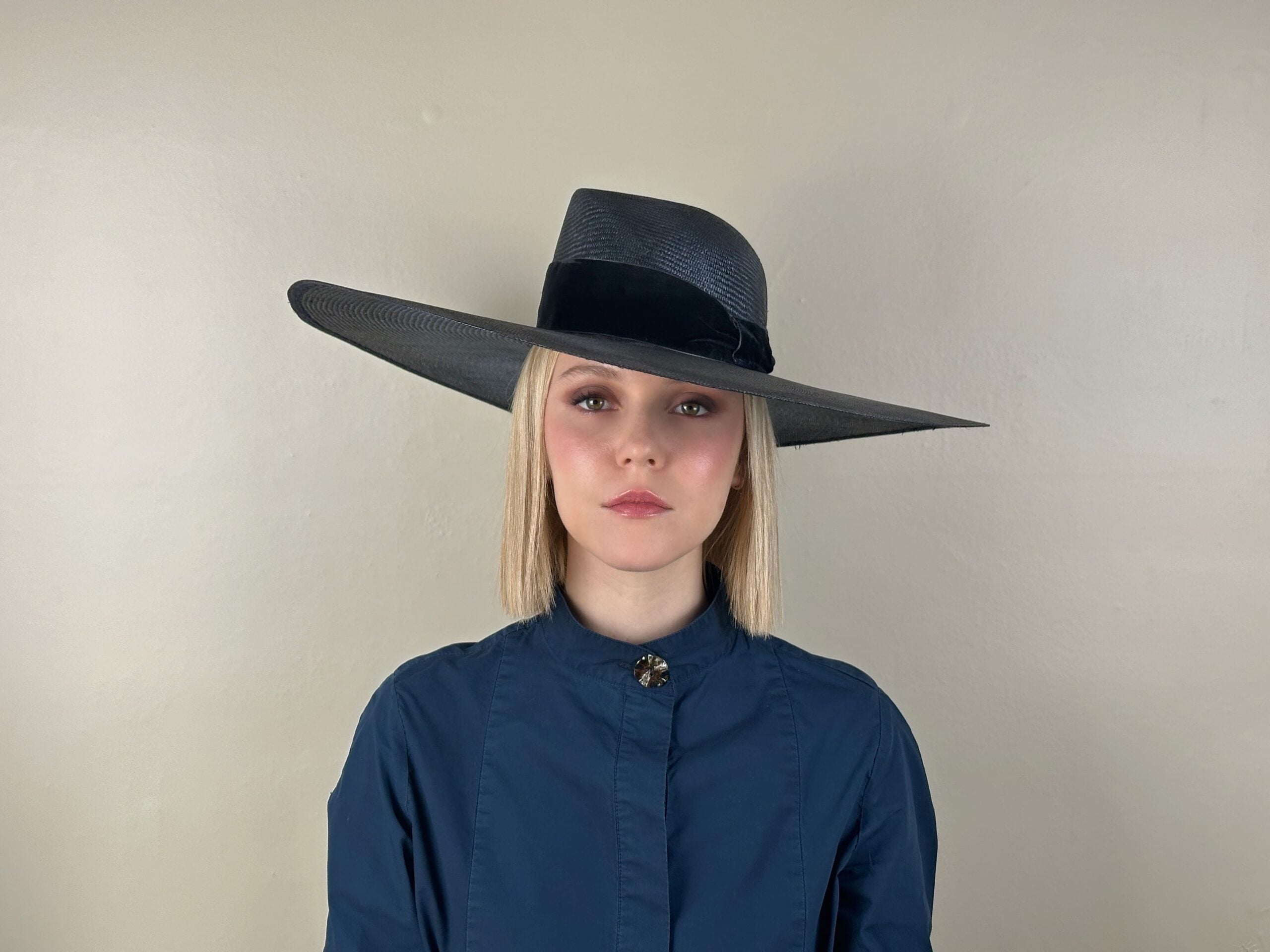 Pamela de parasisal en color azul degradada decorada con cinta de terciopelo.