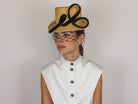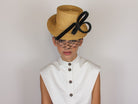 Minichistera de paja cosida en color natural decorada con aplicación negra de terciopelo y velo.