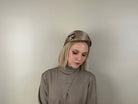 Diadema de abacá y seda en color beige decorada con piedras de cristal facetado beige y negras.