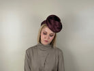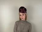 Diadema de abacá y seda color color burdeos con estructura de flor en el mismo tejido.