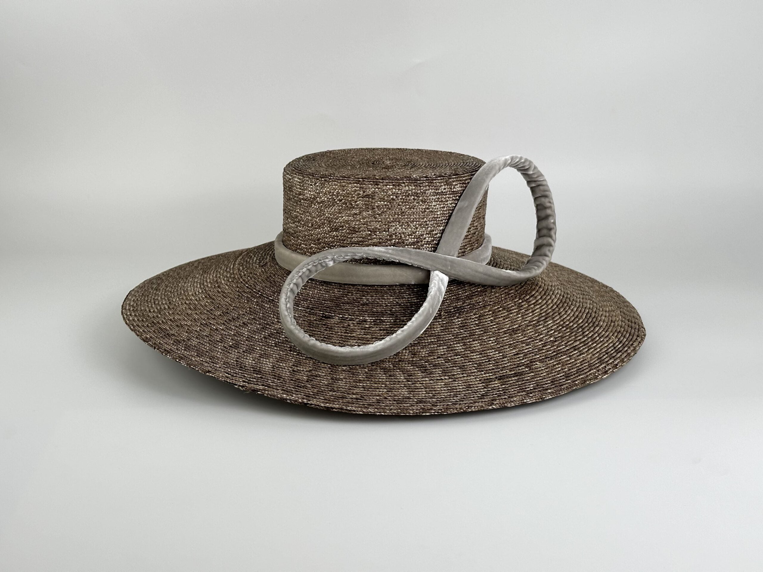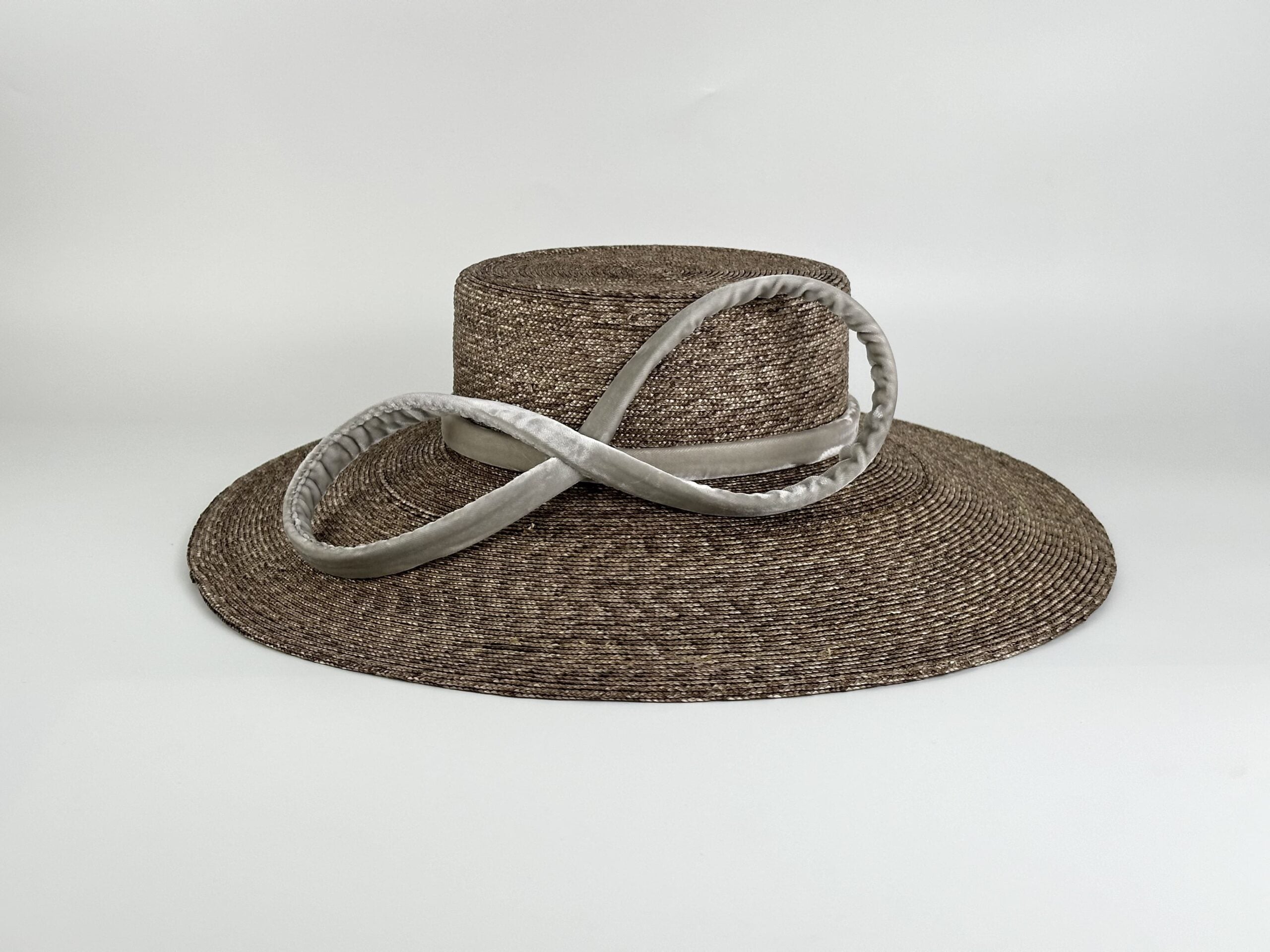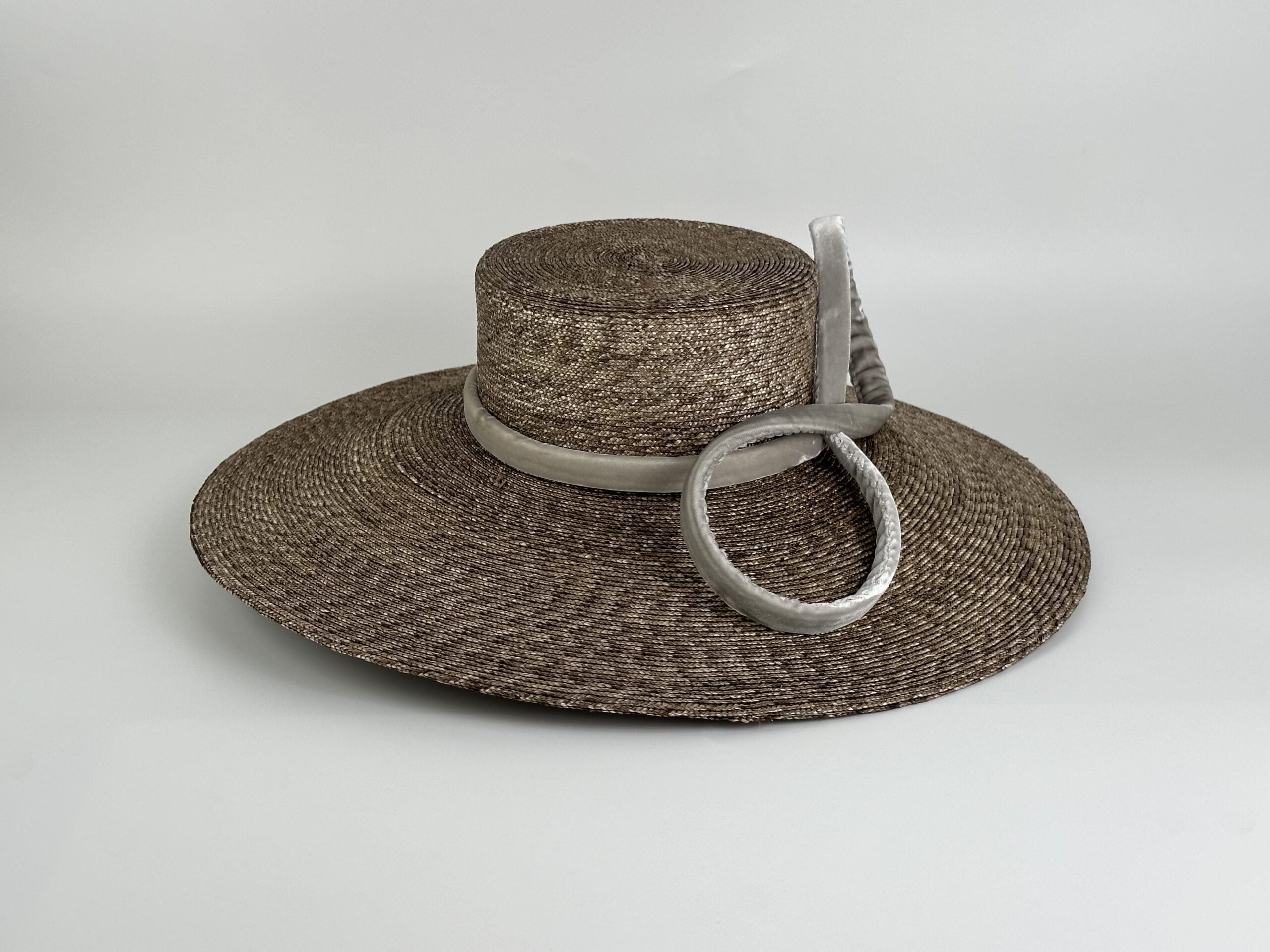 Pamela de paja de trigo trenzada color beige verdoso con lazo de terciopelo de seda.