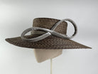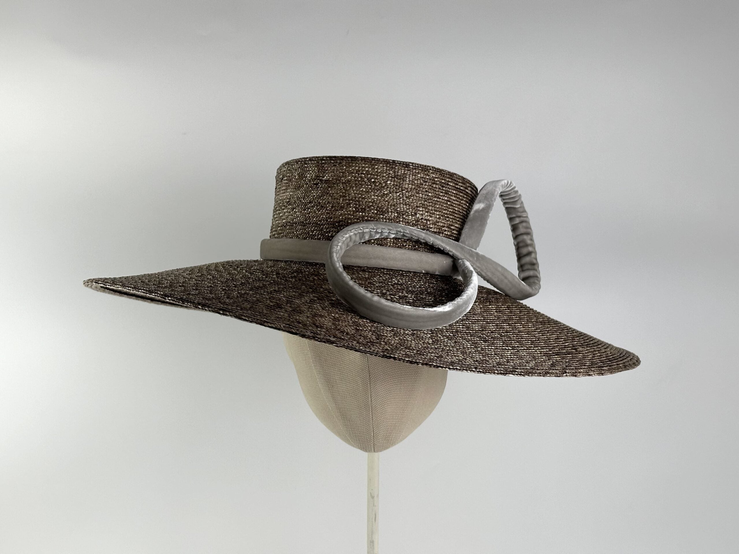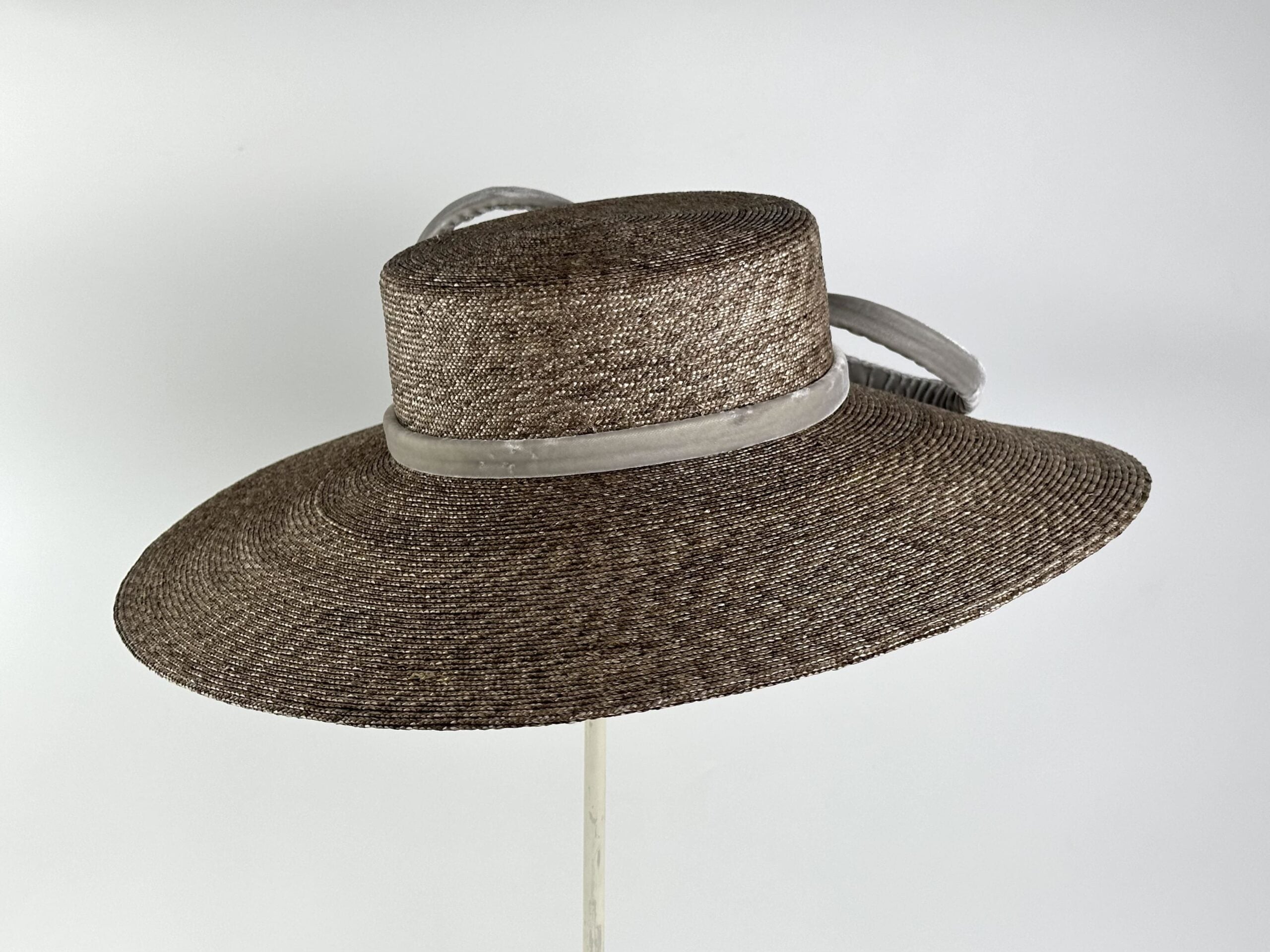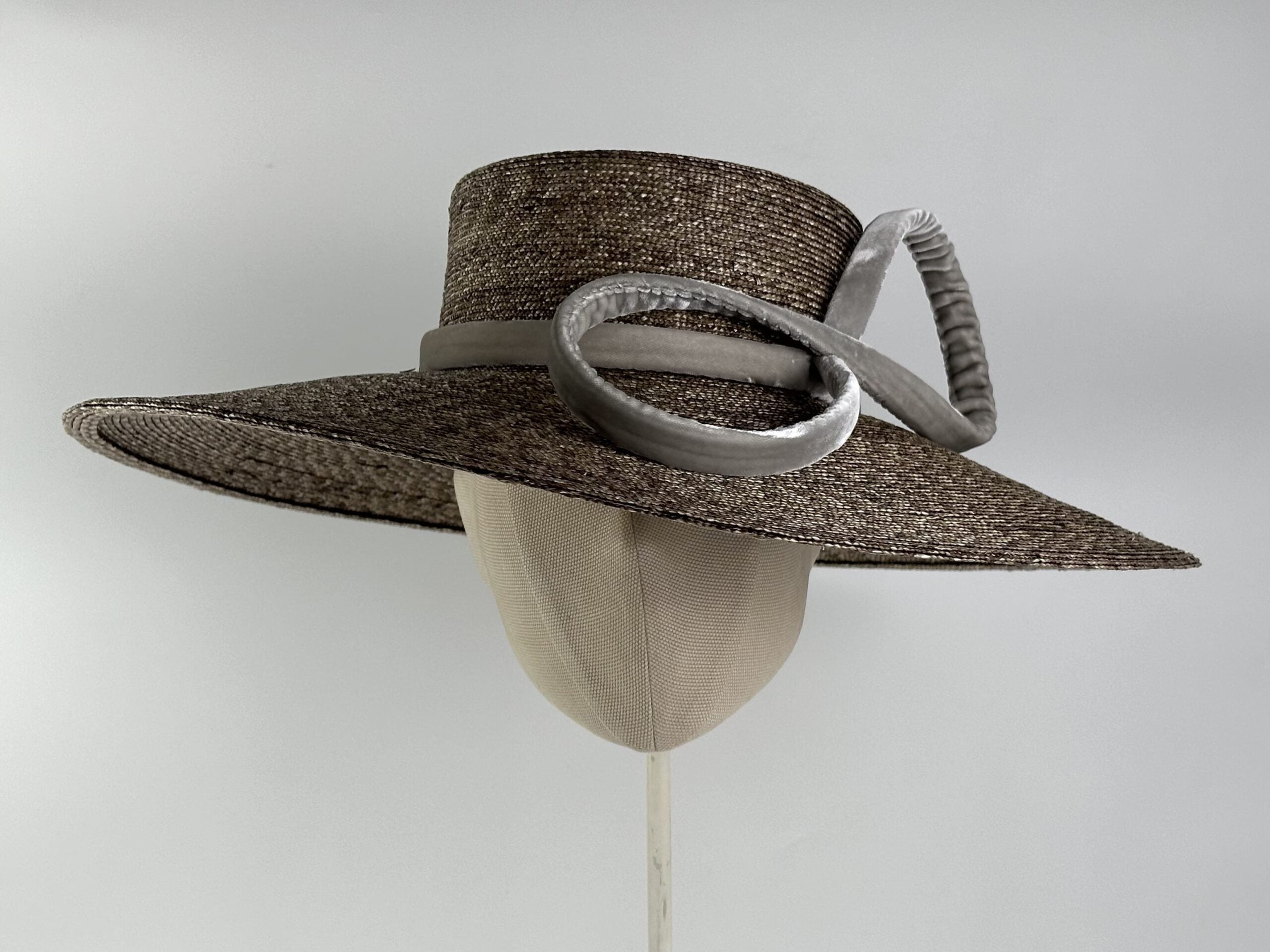 Pamela de paja de trigo trenzada color beige verdoso con lazo de terciopelo de seda.