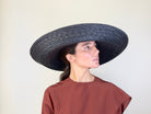 Pamela de paja de trigo cosida negra. Copa redonda y un ala vuelta con aplicación de seda salvaje negra y botón aresano de pasamanería.