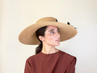 Pamela de paja fina de trigo cosida en color natural decorada con flores de guipur de organza negras y piedras de cristal facetado.