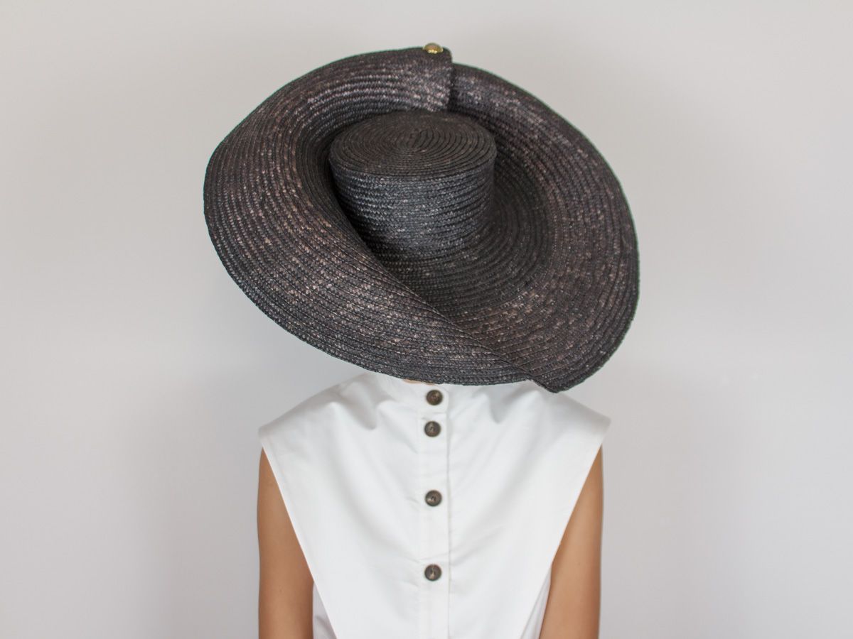 Pamela de paja cosida en color negro decorada con botón dorado.