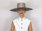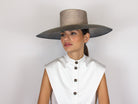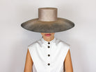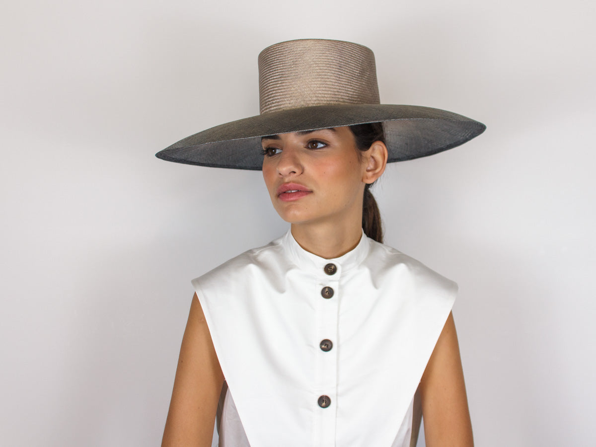 Pamela de sisal degradada en colores gris perla y azul. Copa cuadrada y ala baja.