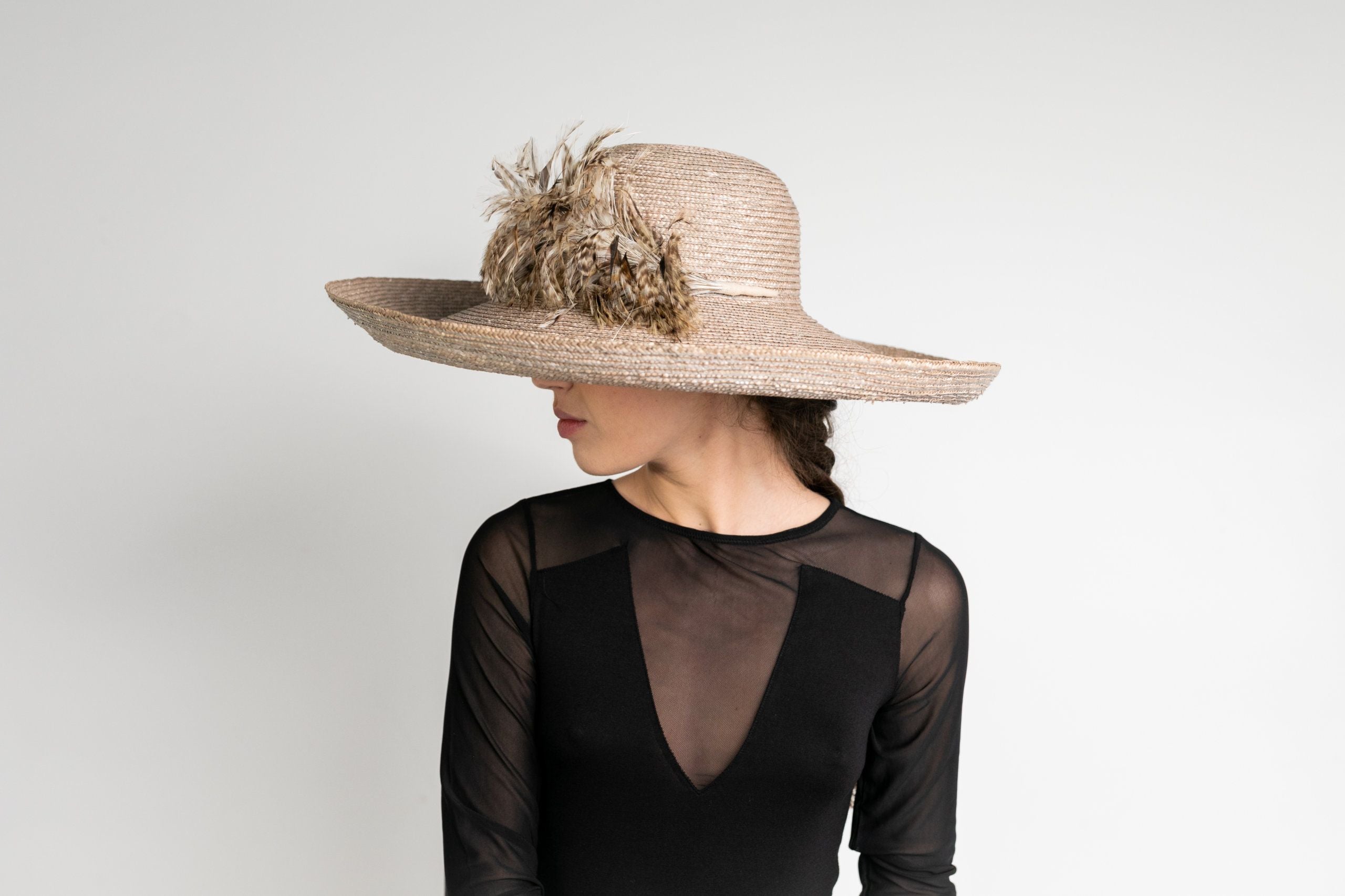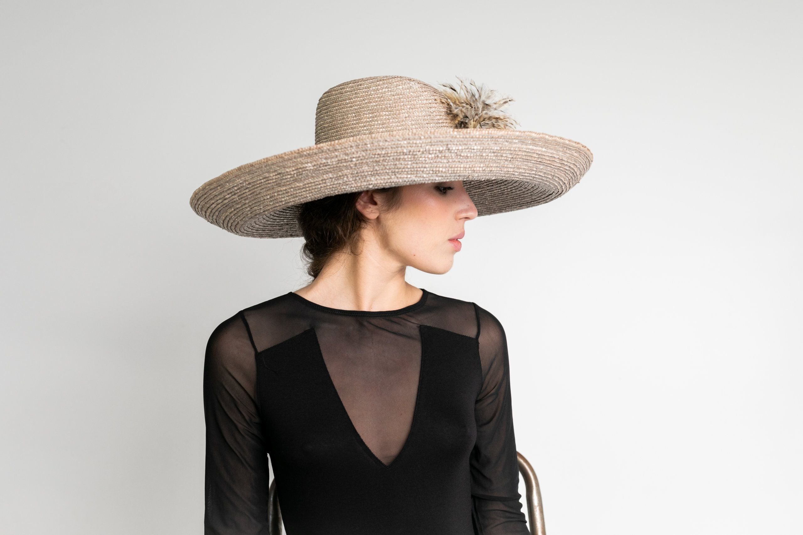 Pamela de paja trenzada en color gris decorada con aplique de plumón en tonos naturales.