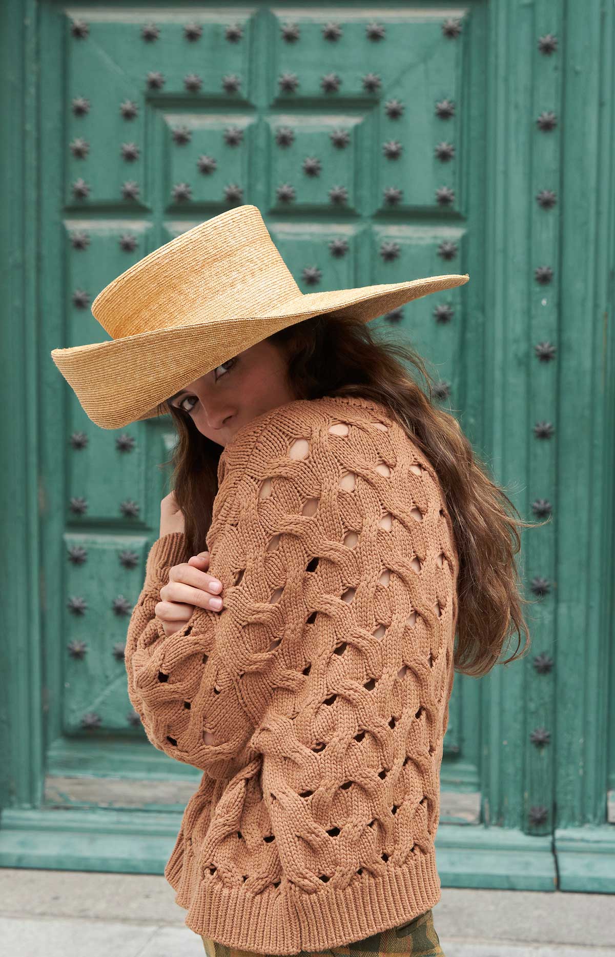 Pamela de paja de trigo trenzada de 4/5 mm, calidad premium, cosida y conformada siguiendo técnicas de sombrerería artesanal.