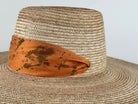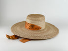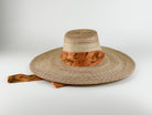Sombrero de paja de trigo trenzada de 4/5 mm, calidad premium, cosida y conformada siguiendo técnicas de sombrerería artesanal. Copa cuadrada y ala ligeramente baja. Decorado con cinta de seda salvaje pintada que puedes utilizar para poderlo atar o colgar a la espalda.
