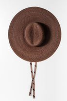 Un versión personal del clásico fedora, con ala ancha y plana. Decorado con una cinta de algodón de rayas pintadas, que puedes utilizar para poderlo atar o colgar a la espalda.