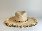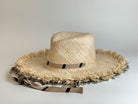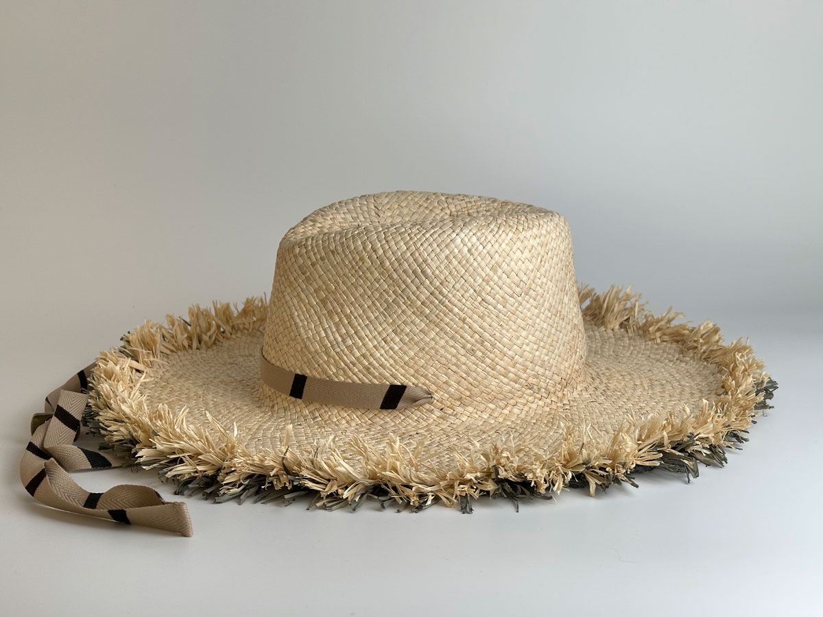 Sombrero fedora bicolor natural y verde seco con ala ancha de bordes desflecados. Lleva una cinta de algodón pintada con rayas negras que hace función de barbuquejo y permite ajustarlo para protegerte contra el viento. También para poder colgarlo cruzado a la espalda para mayor comodidad cuando quieras llevarlo sin usarlo.