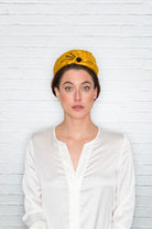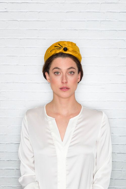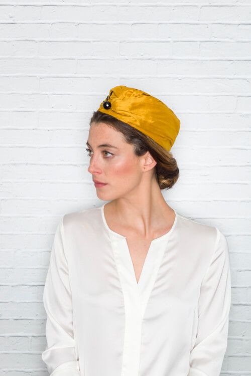 Casquete de seda salvaje en color mostaza decorado con piedras negras.