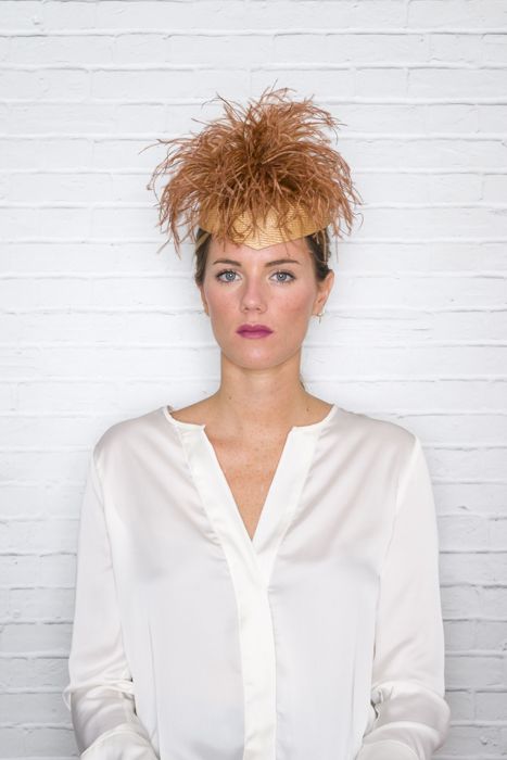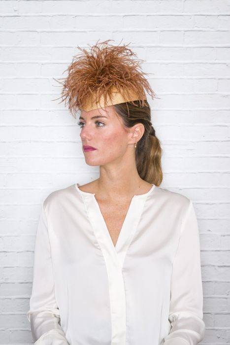 Tocado estilo casquete de parasisal color beige decorado con plumón de avestruz.