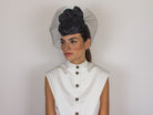 Tocado ideal para invitada de boda de mañana y tarde. Gracias a su forma, estiliza la figura.