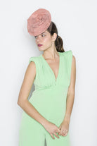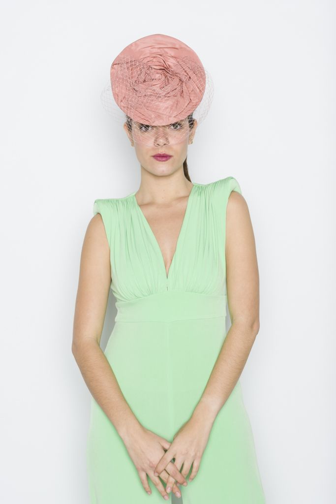 Plato en color rosa salmón con rosetón de tafetán y aplicación de velo.
