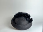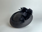 Tocado de sisal inspirado en el sombrero calañés, con flores de plumas.